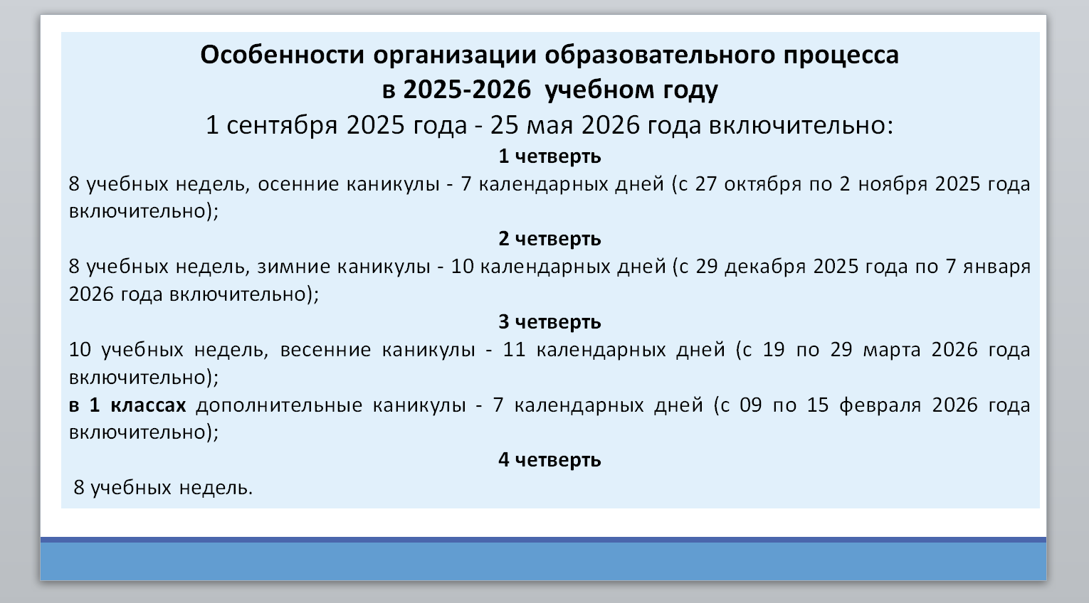 В соответствии с Законом Республики Казахстан «Об образовании», «Государственным общеобязательным стандартом начального, основного среднего и общего среднего образования», приказом Министерства просвещения Республики Казахстан от 05 августа 2025 года № 174 определены следующие сроки начала и завершения 2025-2026 учебного года в организациях среднего образования