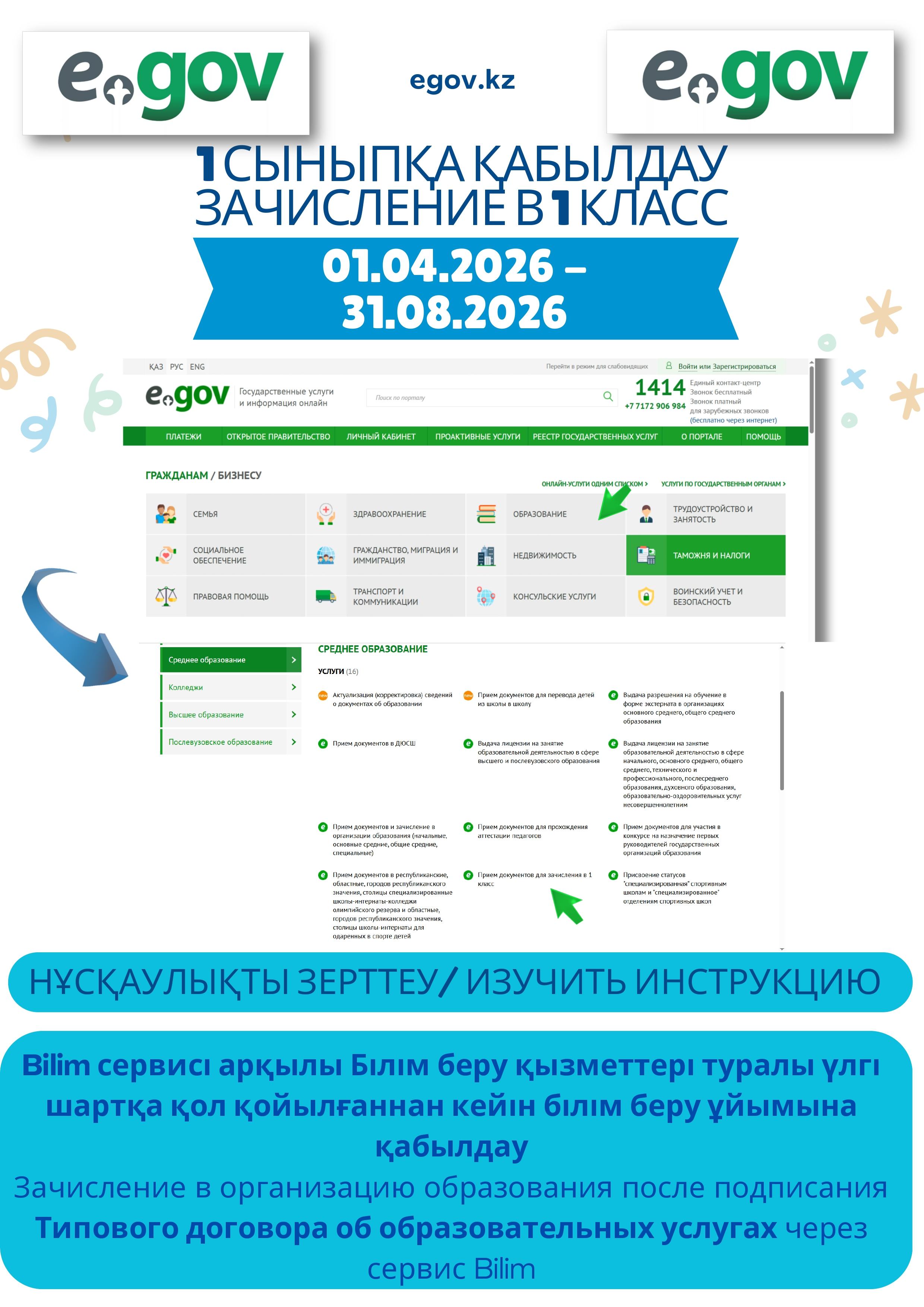 В период с 01.04.2026 по 31.08.2026 будет производится зачисление в 1 класс в КГУ «Общеобразовательная школа №6 отдела образования города Лисаковска» УОАКО согласно стандарту оказания государственной услуги "Прием документов и зачисление в организации образования независимо от ведомственной подчиненности для обучения по общеобразовательным программам начального, основного среднего, общего среднего образования" посредством веб-портала «электронного правительства» www.egov.kz